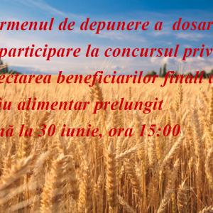 A fost prelungit termenul de depunere a dosarelor de participare la concursul privind selectarea beneficiarilor finali de grâu alimentar ![]() În baza Anunțului de participare la concurs privind împrospătarea cu decalaj în timp a grâului alimentar din rezervele de stat conform Hotărârii Guvernului nr. 346 din l8 mai 2022, publicat/expediat la data de 7 iunie 2022 https://rezerve.gov.md/ro/content/anun%C8%9B-de-participare-la-concurs-privind-%C3%AEmprosp%C4%83tarea-cu-decalaj-%C3%AEn-timp-gr%C3%A2ului-alimentar și a pct.2.1., lit. c) din Regulamentul cu privire la activitatea Comisiei mixte privind eliberarea/recepționarea grâului alimentar din/în rezervele de stat în vederea împrospătării cu decalaj în timp, Comisia mixtă a decis prelungirea termenului de depunere a dosarelor de participare la concursul privind selectarea beneficiarilor finali de grâu alimentar din rezervele de stat în vederea împrospătării cu decalaj în timp, până la data 30 iunie 2022, ora 15:00. Mai multe detalii cu privire la eliberarea/recepționarea grâului alimentar din/în rezervele de stat în vederea împrospătării cu decalaj în timp pot fi accesate pe pagina-web oficială a Agenției Rezerve Materiale www.rezerve.gov.rnd/ , la compartimentul < Cadrul juridic, >, rubrica Regulamentul cu privire la activitatea Comisiei mixte privind eliberarea/recepționarea grâului alimentar din/în rezervele de stat în vederea împrospătării cu decalaj în timp. Telefon penturu contact: 022-24-50-38 sau 022-24-30-22, email: arm@rezerve.gov.md |