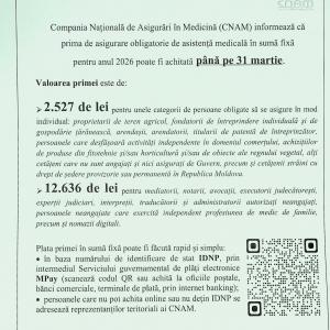 Compania Națională de Asigurări în Medicină (CNAM) informează că prima de asigurare obligatorie de asistență medicală în sumă fixă pentru anul 2026 poate fi achitată până la data de 31 martie 2026.