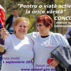 Anunț: Concurs de acordare a Premiului Național pentru vârstnici, cu genericul ”Pentru o viață activă la orice vârstă” ![]() Ministerul Muncii, Protecției Sociale și Familiei lansează Premiul Național pentru vârstnicii de 60 de ani și peste, care au realizat performanţe deosebite în domeniul cultural-artistic, tehnico-ştiinţific, civic, medicină, antreprenoriat, agricultură, educație, sport, tehnologii informaționale, etc.