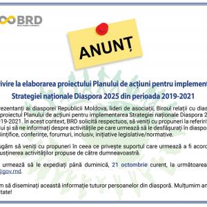 Anunț cu privire la elaborarea proiectului Planului de acțiuni pentru implementarea Strategiei naționale Diaspora 2025 – perioada 2019-2021 ![]() Stimați reprezentanți ai diasporei Republicii Moldova, lideri de asociații, Biroul relații cu diaspora (BRD), din cadrul Cancelariei de Stat, elaborează proiectul Planului de acțiuni pentru implementarea Strategiei naționale Diaspora 2025, pentru perioada 2019-2021. În acest context, BRD solicită respectuos, să veniți cu propuneri referitor la elaborarea Planului și să ne informați despre activitățile pe care urmează să le desfășurați în diasporă: activități culturale, științifice, conferințe, forumuri, inclusiv, inițiative legislative/normative. Totodată, rugăm să veniți cu propuneri în ceea ce privește suportul care urmează a fi acordat de către BRD, întru susținerea activităților propuse de către dumneavoastră. Propunerile urmează să le expediați până duminică, 21 octombrie curent, la următoarea adresă de e-mail: brd@gov.md. Notă: Rugăm să diseminați această informație tuturor persoanelor din diasporă. Mulțumim anticipat pentru receptivitate! https://brd.gov.md/ro/content/anunt-cu-privire-la-elaborarea-proiectului-planului-de-actiuni-pentru-implementarea |
