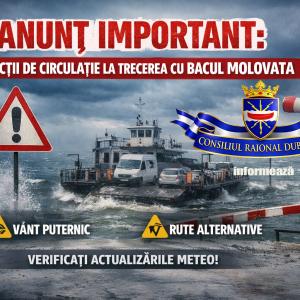 Stimați locuitori ai raionului Dubăsari și participanți la trafic, Consiliul Raional Dubăsari vă informează că, în baza avertizării emise de Î.S. „Bacul Molovata”, condițiile meteorologice nefavorabile din data de 7 aprilie 2026 pot afecta circulația pe râul Nistru.