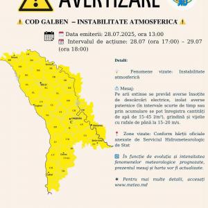 Serviciul Hidrometeorologic de Stat a emis o avertizare Cod Galben de instabilitate atmosferică, valabilă în intervalul: