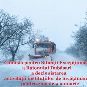 Comisia pentru Situații Excepționale a Raionului Dubăsari a decis sistarea activității instituțiilor de învățământ ![]() Instituțiile de învățământ din raionul Dubăsari își sistează activitatea pentru ziua de 9 ianuarie, zi când elevii trebuiau să revină la studii din vacanța de iarnă. Această decizie a fost luată astăzi, 8 ianuarie 2024, de către Comisia Situații Excepționale a Raionului Dubăsari. Ziua respectivă va fi recuperată ulterior. Această decizie a fost necesară în contextul temperaturilor scăzute și a ninsorilor ce se atestă pe parcursul zilei. Totodată, Președintele raionului Dubăsari, dl Sergiu GRIGORIEV, președinte al Comisiei pentru Situații Excepționale a Raionului Dubăsari a intervenit cu recomandare către instituțiile publice ce activează în teritoriu, indiferent de subordonare, de precăutarea posibilităților de organizare a activității pentru ziua de 9 ianuarie, de la distanță. Stimați locuitori ai raionului Dubăsari, în continuare vă îndemnăm să evitați astăzi călătoriile, iar în caz de înregistrare a unei situații excepționale să apelați la numărul unic 112 sau să informați serviciile operative IP Dubăsari la tel.024855234, 024855466; SSE Dubăsari 024852503, 024844190. Marina LUPAȘCO, specialist superior |