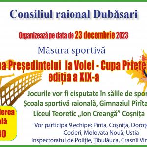 Consiliul raional Dubăsari invită amatorii sportului la Cupa președintelui raionului Dubăsari la Volei, ediția a XIX-a ![]() Sâmbătă, 23 decembrie, 9 echipe amatoare de volei, își dau întâlnire în cadrul Cupei Președintelui la Volei – Cupa Prieteniei.