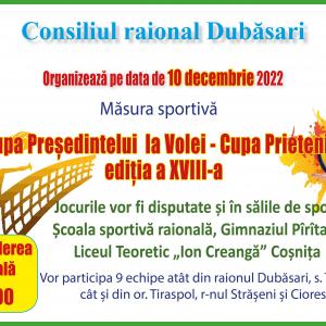 Sâmbătă, 10 decembrie 2022, începând cu orele 9:00, toți doritorii și amatorii probei sportive Volei, sunt invitați la acțiunea cultural-sportivă ,,Cupa Președintelui la Volei – Cupa Prieteniei”.