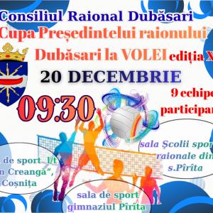 Consiliul raional Dubăsari are plăcerea să anunțe desfășurarea acțiunii cultural-sportive „Cupa Președintelui raionului Dubăsari la volei”, ediția a XXI-a, care va avea loc pe 20 decembrie 2025 în următoarele săli de sport:
