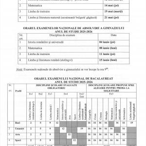 Examenele naționale 2025-2026: informații importante pentru elevi și părinți ![]() Ministerul Educației și Cercetării, împreună cu Agenția Națională pentru Curriculum și Evaluare, anunță programul oficial al examenelor naționale pentru anul de studii 2025-2026. Toate probele vor începe la ora 9:00, indiferent de disciplină, unitatea de învățământ sau centrul de examen, pentru a asigura un proces de evaluare unitar și organizat pentru toți elevii din țară. Orarul cuprinde: