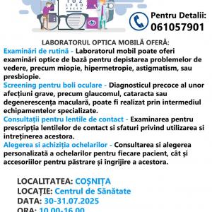 În zilele de miercuri și joi, 30-31 iulie 2025, un laborator oftalmologic mobil din Chișinău va fi prezent în raionul nostru pentru a efectua: