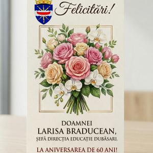 Consiliul Raional Dubăsari adresează cele mai calde și respectuoase felicitări Doamnei Larisa Braducean, Șefă a Direcției Educație, cu prilejul onorantului jubileu de 60 de ani.