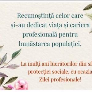 Stimați angajați ai Direcției asistență socială și protecția familiei, cetățeni care ați îndrăgit profesia de lucrător social, cu ocazia zilei profesionale Vă doresc sănătate și bunăstare. Fie ca protecția socială a populației să reprezinte și în continuare pentru Dvoastră o condiție prioritară pentru dezvoltarea umană și sporirea calității vieții.