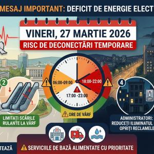 MESAJ IMPORTANT PRIVIND CONSUMUL DE ENERGIE ELECTRICĂ ![]() În baza datelor comunicate de SA Energocom, pentru ziua de vineri, 27 martie 2026, se înregistrează un deficit semnificativ de energie electrică în intervalul orelor de vârf (18:00–22:00), generat de insuficiența capacităților de import disponibile. În aceste condiții, există un risc real de aplicare a deconectărilor temporare, necesare pentru menținerea echilibrului sistemului electroenergetic. Apelul este adresat tuturor categoriilor de consumatori – cetățeni, autorități publice locale și agenți economici – de a reduce consumul de energie, în special în orele de vârf: - dimineața: 06:00–09:00 - seara: 17:00–23:00 Serviciile esențiale și infrastructura critică vor fi alimentate cu prioritate, pentru a asigura continuitatea funcțiilor vitale ale statului și protecția cetățenilor. Alimentarea consumurilor neesențiale depinde direct de nivelul de responsabilitate și cooperare al fiecăruia. Recomandări pentru populație și agenți economici: 1. Cetățenii sunt îndemnați să adopte un consum rațional și să evite utilizarea ascensoarelor în intervalele critice, pentru a preveni blocarea în cazul fluctuațiilor de energie. 2. Se recomandă limitarea utilizării scărilor rulante în orele de vârf. 3. Întreprinderile cu consum ridicat de energie (cuptoare electrice, sudură cu arc etc.) sunt îndemnate să-și reorganizeze procesele de producție în afara orelor de vârf. 4. Administratorii clădirilor publice și comerciale sunt obligați să reducă iluminatul interior cu minimum 30% și să deconecteze iluminatul decorativ și publicitar. 4. Cetățenii sunt încurajați să ia măsuri minime de pregătire pentru eventuale întreruperi temporare: - asigurarea surselor alternative de iluminat - încărcarea dispozitivelor mobile - evitarea utilizării echipamentelor electrice și a ascensoarelor în condiții de risc Fiecare gest contează. Reducerea consumului nu este doar o recomandare, ci o necesitate pentru protejarea funcționării întregului sistem. Împreună putem preveni situațiile critice și asigura continuitatea serviciilor vitale. |