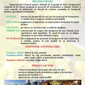 „Pericolul invizibil”- intoxicația cu dioxid de carbon!!! ![]() Secția Situații Excepționale Dubăsari atenționează populația să fie foarte prudenți la procesul de fermentare a vinului. Odată cu sosirea toamnei, cetățenii recurg la procesul de culegere a poamei și ulterior de pregătire a vinului. Un proces care necesită prudență maximă și atenție sporită pentru a evita situațiile neplăcute. Pentru a evita cazurile de intoxicație cu dioxid de carbon, acumulat în încăperile închise, specialiștii recomandă: Evitați– intrarea în încăperile în care are loc procesul de fermentare a vinului, fără a asigura ventilarea prealabilă. Exludeți– amplasarea recipientelor cu must pentru fermentare în spații închise. Anunțați– pe cineva că veți intra într-o astfel de încăpere. Verificați– concentrația de oxigen în încăperea în care intrați, prin aprinderea unei lumânări. În cazul în care se va stinge, înseamnă că nu există suficient oxigen. Nu intrați– fără echipament de protecție în încăperea în care există deja o victimă, pentru că este posibil să vă intoxicați și dumneavoastră. Simptome ale intoxicării!!! Expunere redusă: dureri de cap, amețeli. Expunere medie: dureri de cap persistente, amețeli, somnolență, vomă, puls rapid, reflexe și judecată încetinită. Expunere ridicată– convulsii, comă, deces. Primul ajutor - scoaterea imediată a persoanei din zona de risc; - aerisirea încăperii prin deschiderea ușilor și ferestrelor; - apelarea Serviciului 112; - aport de aer cât mai rapid posibil. Cetățeni nu uitați! Printr-un comportament preventiv, vă salvați viața! În caz de situații de urgență, apelați 112. |
