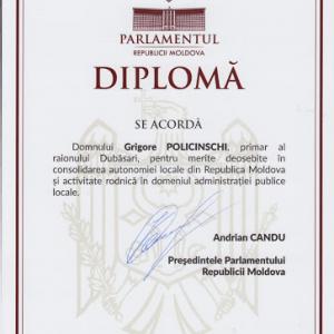 În cadrul adunării generale a Congresului Autorităţilor Locale din Moldova (CALM) sub loganul  „Cinci ani  cu şi fără CALM pentru o descentralizare şi autonomie locală reală! Prezentul şi viitorul Guvernării Locale din Republica Moldova!” şi avînd în vedere consemnarea  sărbătorii profesionale  la 1 februarie a Zilei autonomiei locale şi a lucrătorului din administraţia publică locală, preşedintele raionului dl Grigore POLICINSCHI a fost menţionat cu Diplomă din partea Preşedintelui Parlamentului Republicii Moldova, Andrian Candu, pentru merite deosebite în consolidarea autonomiei locale din Republica Moldova şi activitate rodnică în domeniul administraţiei publice locale.