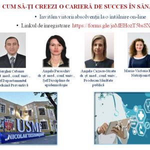 Programul nou de Sănătate publică pentru absolvenți în licee! ![]() Stimați absolvenți ai liceelor și viitori abiturienți Universitatea de Stat de Medicină și Farmacie Nicolae Testemițanu vine cu o solicitare către D-voastră, privind un program nou deschis la Sănătate publică. Reieșind din situația pandemică în care ne aflăm și necesitatea stringentă a sistemului de sănătate în specialiști în Sănătate publică, venim în fața dvs. cu un mesaj, care ar putea să vă determine alegerea sferei de activitate pe viitor. Dacă doriți să faceți o schimbare și sunteți curioși să aflați ce este Sănătatea publică, alocați puțin timp și veniți la o întâlnire online cu specialiștii din domeniul, care va avea loc pe 28.04.2021, orele 15:00. Pentru aceasta vă rugăm să vă înregistrați pe linkul: https://forms.gle/N3Up5bP8JnrEYufi6 |