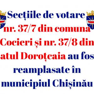 Secțiile de votare din Cocieri și Doroțcaia, relocate la Chișinău ![]() Consiliul raional Dubăsari informează cetățenii că, în cadrul ședinței din 25 septembrie curent, Comisia Electorală Centrală a decis relocarea mai multor secții de votare destinate alegătorilor din stânga Nistrului. Decizia a fost luată urmare a sesizării Inspectoratului General al Poliției, care a atenționat asupra existenței unor riscuri majore la adresa securității în zona de securitate, inclusiv posibile alerte cu bombă și provocări în ziua votării. În asemenea situații, intervenția echipelor specializate ar fi dificilă, întrucât deplasarea acestora se poate efectua doar cu aprobarea Comisiei Unificate de Control, ceea ce face imposibilă o reacție rapidă. Astfel, secțiile de votare nr. 37/7 din comuna Cocieri și nr. 37/8 din satul Doroţcaia au fost reamplasate în municipiul Chișinău. Totodată, CEC a decis reamplasarea următoarelor secții de votare: - nr. 37/3 și nr. 37/4 din satul Varnița, raionul Anenii Noi – în orașul Anenii Noi; - nr. 37/6 din satul Hagimus, raionul Căușeni – în orașul Căușeni. De asemenea, pentru a gestiona eficient eventualele riscuri legate de alerte cu bombă sau alte provocări, au fost stabilite locații de rezervă pentru alte secții de votare din apropierea zonei de securitate: - pentru secția nr. 37/2 Gura Bîcului – comuna Calfa, Anenii Noi; - pentru secția nr. 37/5 Copanca – satul Chircăiești, Căușeni; - pentru secția nr. 37/9 Sănătăuca – satul Cunicea, Florești; - pentru secțiile nr. 37/10 și nr. 37/11 din orașul Rezina – satul Cinișeuți, Rezina; - pentru secția nr. 37/12 Răscăieți – orașul Ștefan Vodă. Consiliul raional Dubăsari face apel către alegători să se informeze din timp privind noile locații ale secțiilor de votare și să își exercite dreptul constituțional la vot. Marina LUPAȘCO, specialistă principală |