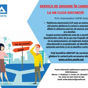 Servicii de ghidare în carieră la un click distanță! ![]() SOFM Dubăsari oferă servicii de ghidare în carieră prin intermediul platformei CCP (Cognitrom Career Planner) care până în anul 2021 puteau fi accesate doar fizic, la sediul subdiviziunii teritoriale. În prezent, platforma CCP poate fi accesată și de la distanță, de către orice utilizator! Pentru aceasta, persoana are nevoie doar de telefon, tabletă, sau calculator, cu conectare la rețeaua de internet. Platforma electronică CCP este un instrument util pentru ghidarea în carieră a persoanelor aflate în căutarea unui loc de muncă, a şomerilor, precum și a elevilor și cadrelor didactice. Scopul acestei platforme este de a permite beneficiarilor chiar de la cea mai fragedă vârstă să se autocunoască, să exploreze lumea educațională și ocupațională, să identifice opțiunile potrivite și să-și planifice cariera. Persoanele care își doresc un loc de muncă, dar nu știu în ce domeniu s-ar regăsi, sunt îndemnate să acceseze site-ul www.cariera.anofm.md, să butoneze „Test Cariera”, să completeze câmpurile solicitate, astfel lăsând o cerere către SOFM. Specialistul SOFM va recepționa mesajul și va expedia datele de acces pe platformă. Pentru a vedea pașii de urmat pentru utilizarea corectă a Platformei CCP de la distanță, puteți vizualiza ghidul video, accesând https://testcariera.anofm.md/ghid-video/, conceput pentru a oferi informație în acest scop. Totodată, doritorii se pot adresa la subdiviziunea teritorială pentru ocuparea forței de muncă pentru a beneficia de servicii de ghidare în carieră prin intermediul platformei CCP și a găsi locul de muncă potrivit. Este de menționat faptul că subdiviziunea teritorială a fost dotată cu platforma CCP cu suportul Centrului pentru Educație Antreprenorială și Asistență în Afaceri, cu sprijinul financiar din partea Agenției Austriece pentru Dezvoltare, în cadrul proiectului „Reconceptualizarea Orientării Profesionale și Consilierii în Carieră”. Secția pentru Ocuparea Forței de Muncă Dubăsar |