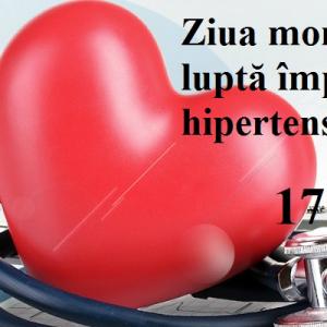 Un om sănătos un succes pentru societate ![]() Ziua mondială de luptă împotriva hipertensiunii este marcată anual, la 17 mai. Această zi a fost instituită cu scopul sensibilizării populaţiei asupra efectelor tensiunii arteriale crescute și de a încuraja cetăţenii din întreaga lume să prevină şi să controleze tensiunea arterială crescută ce constituie principalul factor de risc al apariţiei bolilor cardiovasculare. Hipertensiunea arterială (HTA), cunoscută de asemenea sub numele de tensiune arterială crescută sau hipertensiune, este o boală cronică caracterizată prin valori crescute ale presiunii arteriale a sângelui. Valoarea ridicată face ca inima să pompeze într-un ritm mai accelerat față de ritmul normal pentru a propulsa sângele în vasele sangvine. Presiunea arterială este de două tipuri: presiunea arterială sistolică (presiunea sângelui în artere în timpul contacției mușchiului cardiac) și presiunea arterială diastolică (presiunea sângelui în perioada de relaxare a mușchiului cardiac). Măsurarea presiunii în vasele de sânge sau în cavitățile inimii se poate realiza fie prin metode directe, foarte rar și numai în anumite cazuri deoarece necesită introducerea în vasele sanguine a unei sonde, fie, cel mai frecvent, printr-o metodă indirectă, măsurând tensiunea pereților arteriali cu ajutorul unui aparat numit tensiometru. În perioada de repaus, presiunea arterială normală se încadrează între 100–140 mmHg în cazul presiunii arteriale sistolice (limita superioară) și 60–90 mmHg în cazul presiunii arteriale diastolice (limita inferioară). Presiunea arterială ridicată se identifică cu valori persistente ale presiunii arteriale egale cu sau mai mari de 140/90 mmHg. Hipertensiunea arterială este clasificată fie ca hipertensiune arterială primară (esențială) sau hipertensiune arterială secundară. Circa 90–95% din cazuri fac parte din categoria „hipertensiunii arteriale primare”, ceea ce înseamnă presiune arterială crescută fără a avea la bază o cauză medicală evidentă. Alte afecțiuni la nivelul rinichilor, arterelor, inimii sau sistemului endocrin determină restul de 5–10% din cazuri (hipertensiune arterială secundară). Hipertensiunea arterială este un factor de risc major pentru cazurile de atac de cord (infarct miocardic), insuficiență cardiacă, anevrisme ale arterelor, boală arterială periferică și este cauza bolilor renale cronice. Chiar și o creștere moderată a valorilor tensiunii arteriale este asociată cu o speranță de viață mai redusă. Netratată, sau tratată necorespunzător,hipertensiunea arterială poate duce la invaliditate, infarct sau atac cerebral. De ce este important să cunoașteți valorile TA: • OMS estimează că unul din trei adulți cu vârstă de 25 de ani și mai mare suferă de hipertensiune arterială, ceea ce reprezintă peste 1,8 miliarde de oameni. În același timp, aproximativ 50% dintre bolnavi nu știu despre această tulburare. • La nivel mondial, bolile cardiovasculare provoacă aproximativ 17 milioane de decese pe an, iar aceasta este aproape o treime din numărul total de decese. Dintre acestea, complicațiile hipertensiunii cauzează 9.4 milioane de decese în lume anual. • IMPORTANT! Dacă hipertensiunea arterială este depistată în timp util, putem minimiza riscul de a dezvolta infarct miocardic, accident vascular cerebral, insuficiență cardiacă și renală. Fapte despre hipertensiune: • Hipertensiunea crește direct riscul de atac de cord și accident vascular cerebral. • Hipertensiunea este mai frecventă în rândul persoanelor care suferă de diabet, obezitate, guta sau afecțiuni renale; cei în familia cărora au existat boli similare. • Riscul este mai mare pentru persoanele cu obiceiuri proaste – fumatori, alcoolici, etc. • Importanța monitorizării tensiunii arteriale crește odată cu vârsta, dar, din păcate, hipertensiunea se întâlnește și în rândul copiilor și adolescenți. • Hipertensiunea este o boală asimptomatică, de aceea se numește „ucigaș tăcut”. Simptomele precum durerile de cap, somnolența, palpitațiile, vederea încețoșată, amețeli, dificultăți de respirație, oboseală etc. se manifestă atunci când boala a progresat deja. Ce puteți face pentru a minimiza riscul apariției hipertensiunii arteriale și dezvoltarea consecințelor sale: • Mențineți un stil de viață sănătos și, cel mai important, insuflându-l și generației tinere. • Reduceți cantitatea de sare la 5 grame pe zi, precum și consumul de grăsimi, în special cele saturate. Consumați zilnic cel puțin 5 fructe și legume. • Renunțați la obiceiurile proaste. • Făceți cel puțin 30 de minute de exerciții pe zi și de cel puțin cinci ori pe săptămână. • Mențineți o greutate corporală normală. Indicele de masă corporală (nu trebuie să fie mai mare de 25), poate fi calculat prin împărțirea greutății în kilograme la înalțime în metri la pătrat. De asemenea, puteți măsura talia. La bărbați, această cifră nu trebuie să depășească 102 cm și la femei 88. • Învățați să controlați stresul, care astăzi, din nefericire, este mult prea prezent în viețile tuturor. |