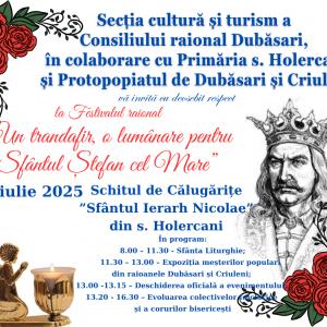 „Un trandafir, o lumânare pentru Sfântul Ștefan cel Mare” ![]() Cu prilejul comemorării Marelui Voievod Ștefan cel Mare și Sfânt, Secția cultură și turism a Consiliului raional Dubăsari, în colaborare cu Primăria s. Holercani și Protopopiatul de Dubăsari și Criuleni, vă invită cu deosebit respect să luați parte la Festivalul raional „Un trandafir, o lumânare pentru Sfântul Ștefan cel Mare”, care va avea loc pe data de 13 iulie 2025, la Schitul de Călugărițe „Sfântul Ierarh Nicolae” din s. Holercani, al Mănăstirii „Sfântul Mare Mucenic Teodor Tiron” din or. Chișinău. Programul evenimentului: 08:00 – 11:30 – Sfânta Liturghie 11:30 – 13:00 – Expoziția meșterilor populari din raioanele Dubăsari și Criuleni 13:00 – 13:15 – Deschiderea oficială a evenimentului 13:20 – 16:30 – Evoluția colectivelor folclorice și a corurilor bisericești. Evenimentul, desfășurat în mirificul cadru al schitului de pe malul Nistrului din s. Holercani, raionul Dubăsari, are drept scop promovarea folclorului autentic, a cântecului popular patriotic, precum și a tradițiilor creștine de comemorare a Marelui Voievod. La Festival vor participa formații folclorice și coruri bisericești din raioanele Dubăsari și Criuleni. Vă așteptăm cu drag să fiți parte a acestui moment de profundă recunoștință și trăire sufletească. |