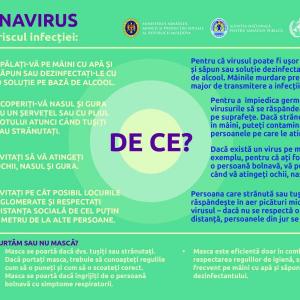 Oamenii se pot infecta cu COVID-19 de la alte persoane care au virusul. Boala se poate răspândi de la o persoană la alta prin picături mici nazale sau din gură, care sunt răspândite atunci când o persoană cu COVID-19 tușește sau expiră. Majoritatea persoanelor infectate se confruntă cu boli ușoare și se recuperează, dar poate fi mai severă pentru alții. Aveți grijă de sănătatea dvs. și protejați-i pe alții, respectând următoarele reguli: